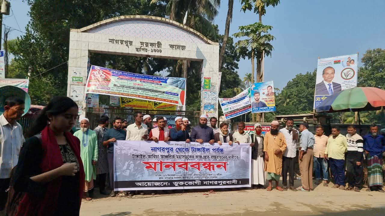 টাঙ্গাইল-আরিচা আঞ্চলিক সড়কের কাজ দ্রুত বাস্তবায়নের দাবিতে মানববন্ধন করেছে নাগরপুরবাসী।