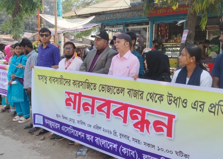 নন ফুড গ্রেড ড্রামের তেল সংরক্ষণ ও বিক্রি তাৎক্ষণিকভাবে বন্ধ করা। ভোজ্য তেলের জন্য ফুড গ্রেড পাত্র ব্যবহার বাধ্যতামূলক করার দাবিতে লালমনিরহাটে মানববন্ধন অনুষ্ঠিত হয়েছে। বুধবার সকালে জেলার মিশন মোড়ে এ মানববন্ধন কর্মসূচি অনুষ্ঠিত হয়। কনজুমারস এসোসিয়েশন অব বাংলাদেশ (ক্যাব) লালমনিরহাট জেলা শাখার আয়োজনে এ মানববন্ধন অনুষ্ঠানে সভাপতিত্ব করেন ক্যাব লালমনিরহাট শাখার সহ-সভাপতি প্রফেসর (অব:) হারুন অর রশিদ।