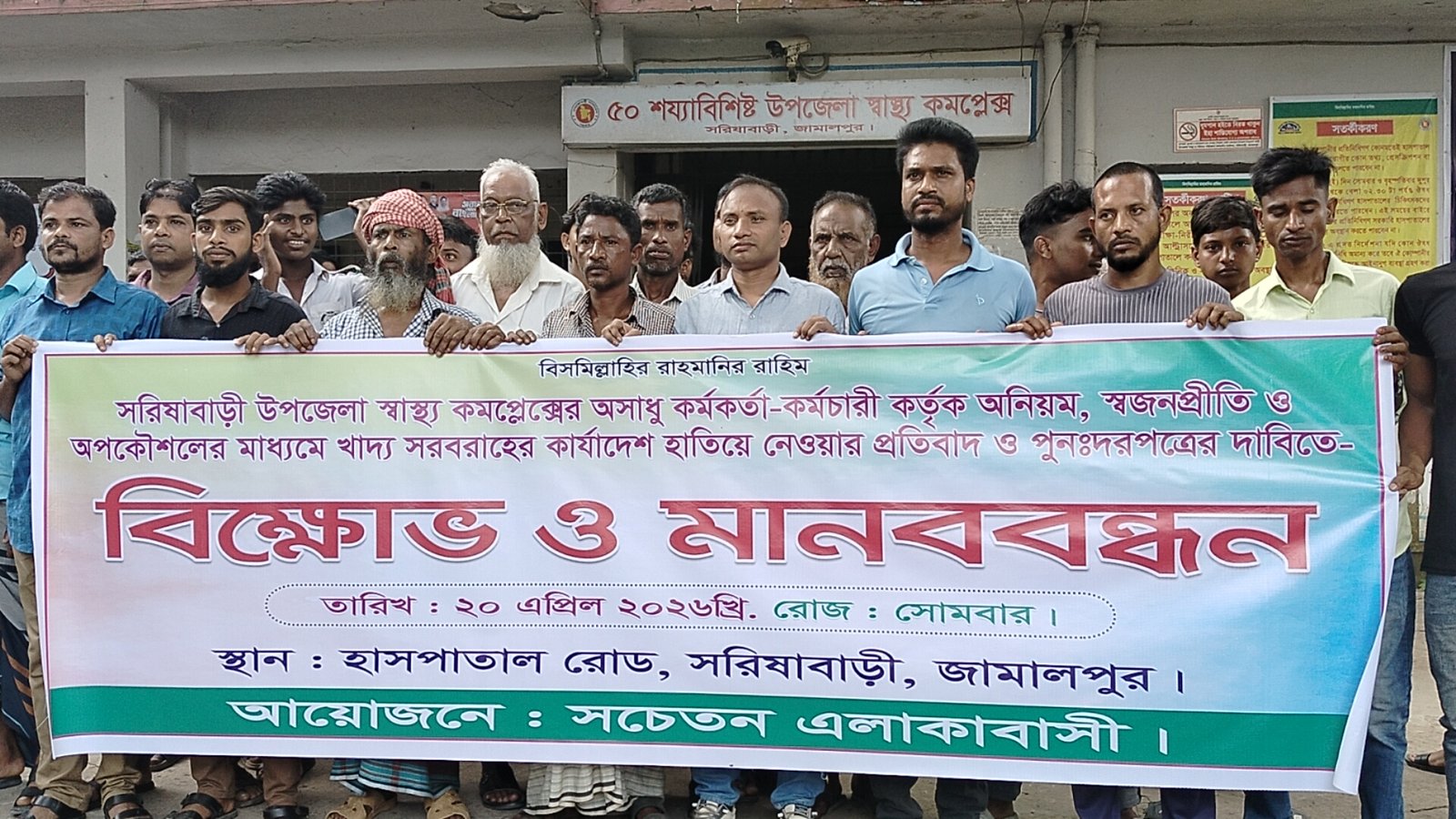 জামালপুরের সরিষাবাড়ী উপজেলা স্বাস্থ্য কমপ্লেক্সে খাদ্য সরবরাহের দরপত্র প্রক্রিয়ায় অনিয়ম ও স্বজনপ্রীতির অভিযোগে বিক্ষোভ ও মানববন্ধন অনুষ্ঠিত হয়েছে।