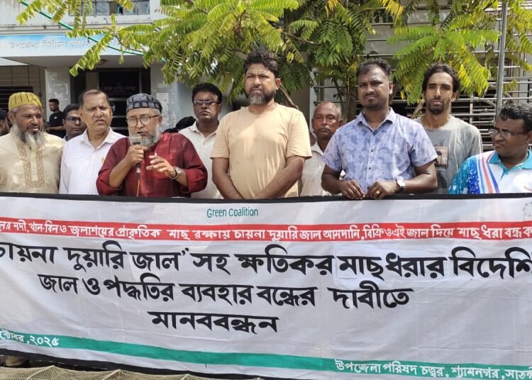 বাংলাদেশের উপকূলীয় নদ-নদীতে “চায়না দুয়ারি জাল”সহ ক্ষতিকর বিদেশি মাছ ধরার জাল ও পদ্ধতি নিষিদ্ধ করার দাবিতে সাতক্ষীরার শ্যামনগরে মানববন্ধন অনুষ্ঠিত হয়েছে। পরে উপজেলা নির্বাহী কর্মকর্তার মাধ্যমে মৎস্য ও প্রাণিসম্পদ মন্ত্রণালয়ের মাননীয় উপদেষ্টার বরাবর একটি স্মারকলিপি প্রদান করা হয়।