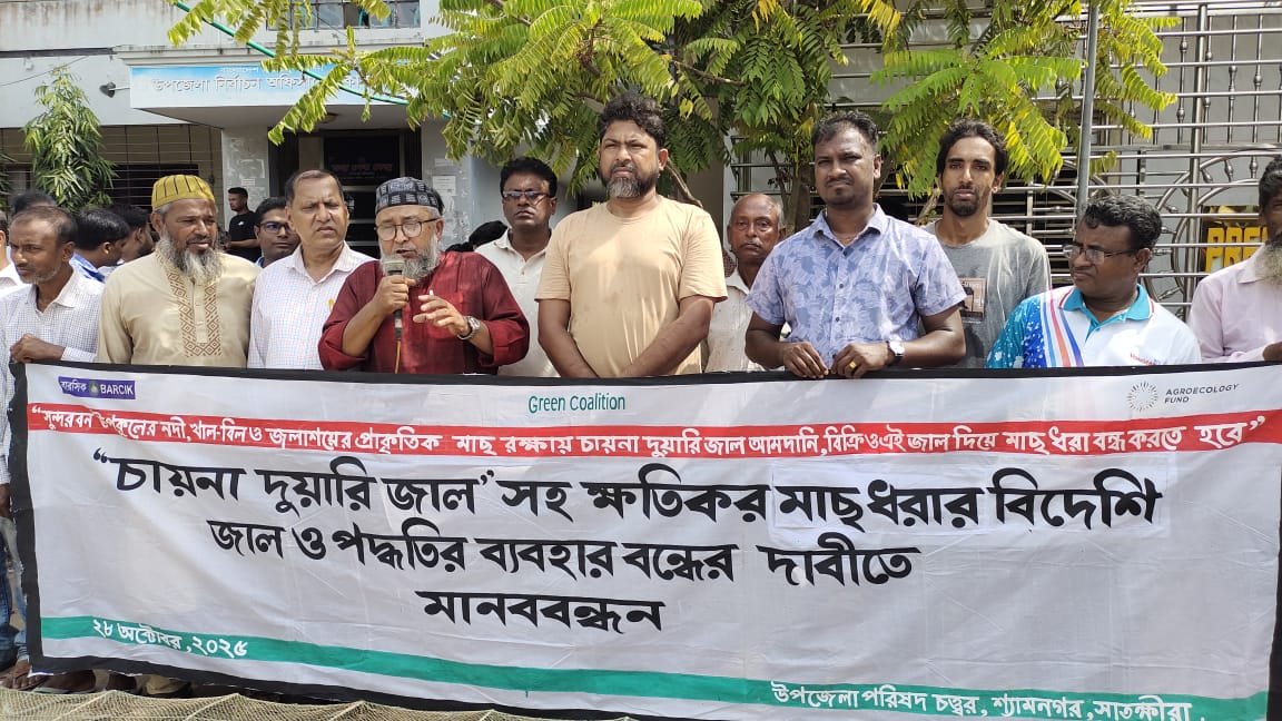 বাংলাদেশের উপকূলীয় নদ-নদীতে “চায়না দুয়ারি জাল”সহ ক্ষতিকর বিদেশি মাছ ধরার জাল ও পদ্ধতি নিষিদ্ধ করার দাবিতে সাতক্ষীরার শ্যামনগরে মানববন্ধন অনুষ্ঠিত হয়েছে। পরে উপজেলা নির্বাহী কর্মকর্তার মাধ্যমে মৎস্য ও প্রাণিসম্পদ মন্ত্রণালয়ের মাননীয় উপদেষ্টার বরাবর একটি স্মারকলিপি প্রদান করা হয়।