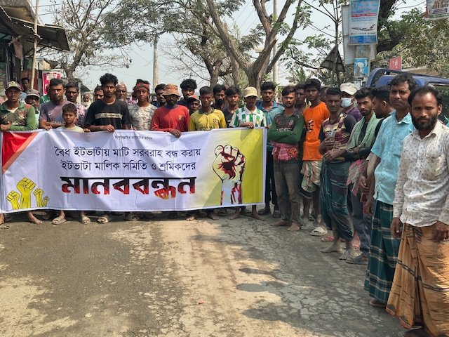 বৈধ লাইসেন্সপ্রাপ্ত ইটভাটায় মাটি সরবরাহ বন্ধ করে দেওয়ার প্রতিবাদে এবং দ্রুত সরবরাহ স্বাভাবিক করার দাবিতে মুন্সীগঞ্জের সিরাজদিখানে মানববন্ধন ও বিক্ষোভ কর্মসূচি পালন করেছেন জেলা ইটভাটা মালিক সমিতির নেতৃবৃন্দ ও শ্রমিকরা।