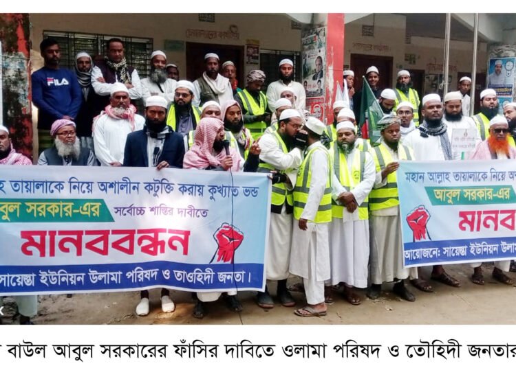 শুক্রবার (২৮ নভেম্বর) সকাল ৯টায় উপজেলার সায়েস্তা ইউনিয়ন পরিষদের সামনে মানববন্ধনের আয়োজন করে সায়েস্তা ইউনিয়ন উলামা পরিষদ ও তৌহদী জনতা। এতে সভাপতিত্ব করেন মুফতি সোলাইমান। প্রধান অতিথি হিসেবে বক্তব্য রাখেন, সাংগঠনিক সম্পাদক হেফাজতে ইসলাম মানিকগঞ্জ সদর ও বৈষম্য বিরোধী ছাত্র আন্দোলনের মানিকগঞ্জ জেলার সিনিয়র যুগ্ম আহবায়ক রমজান মাহমুদ।