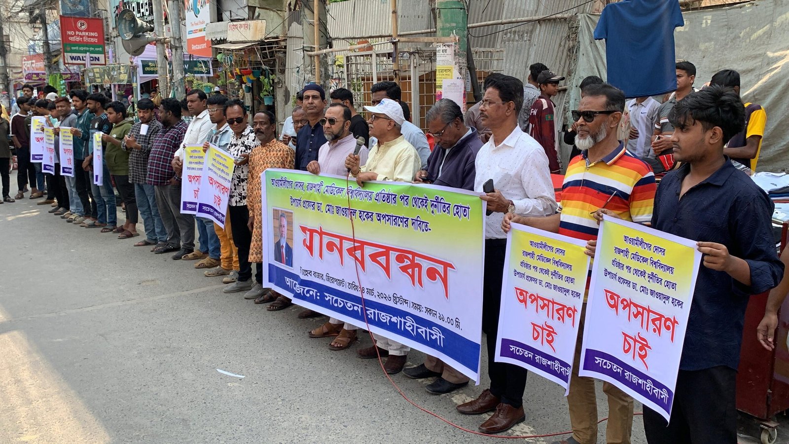 রাজশাহী মেডিকেল বিশ্ববিদ্যালয় (রামেবি) প্রতিষ্ঠার শুরু থেকেই অনিয়ম-দুর্নীতির অভিযোগে উপাচার্য প্রফেসর ডা. মো. জাওয়াদুল হক ও তার পিএস নাজমুল হোসেনের অপসারণের দাবিতে বুধবার (৪ মার্চ) বেলা ১১টায় নগরীর সাহেববাজার জিরোপয়েন্টে বিশাল মানববন্ধন অনুষ্ঠিত হয়েছে।