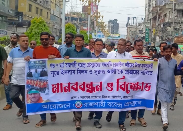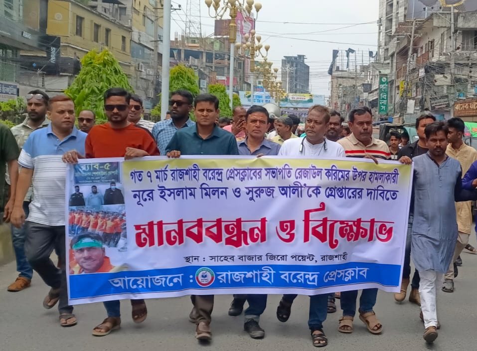 রাজশাহী বরেন্দ্র প্রেসক্লাবের সভাপতি রেজাউল করিমের ওপর সশস্ত্র হামলার প্রতিবাদে মানববন্ধন ও বিক্ষোভ কর্মসূচি অনুষ্ঠিত হয়েছে। হামলার সঙ্গে জড়িতদের দ্রুত গ্রেপ্তারের দাবিতে সাংবাদিক নেতারা ক্ষোভ প্রকাশ করেছেন।