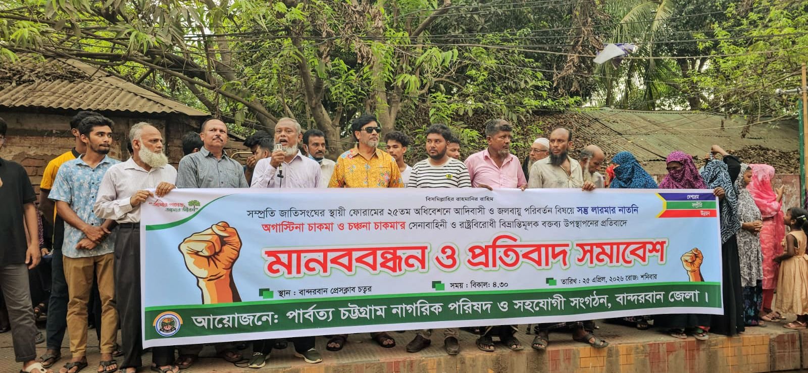 সম্প্রীতি জাতিসংঘের স্থায়ী ফোরামের ২৫ তম অধিবেশনে আদিবাসী ও জলবায়ু পরিবর্তন বিষয়ে সন্তু লারমার নাতনি অগাস্টিনা চাকমা ও চঞ্চনা চাকমারা বাংলাদেশ সেনাবাহিনী ও রাষ্ট্রবিরোধী ও বিভ্রান্তিমূলক বক্তব্য উপস্থাপনের প্রতিবাদে বিক্ষোভ মিছিল ও প্রতিবাদ সমাবেশ অনুষ্ঠিত হয়েছে।
