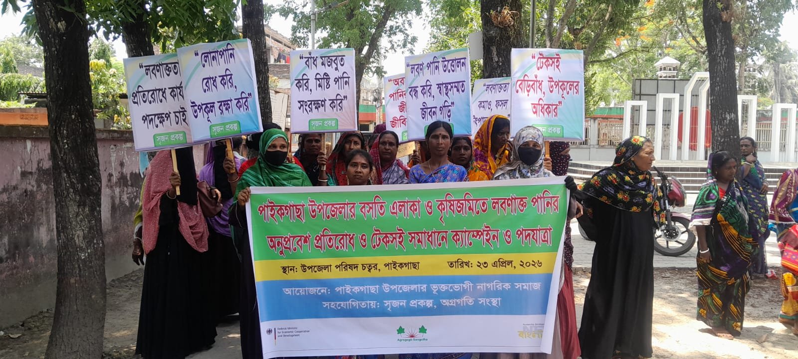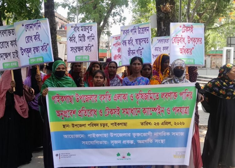 খুলনার পাইকগাছা উপজেলায় বসতি এলাকা ও কৃষিজমিতে লবণাক্ত পানির অনুপ্রবেশ প্রতিরোধে মানববন্ধন, ক্যাম্পেইন ও পদযাত্রা অনুষ্ঠিত হয়েছে। বৃহস্পতিবার (২৩ এপ্রিল) উপজেলা পরিষদ চত্বরে ভুক্তভোগী নাগরিক সমাজ এ কর্মসূচি পালন করে।