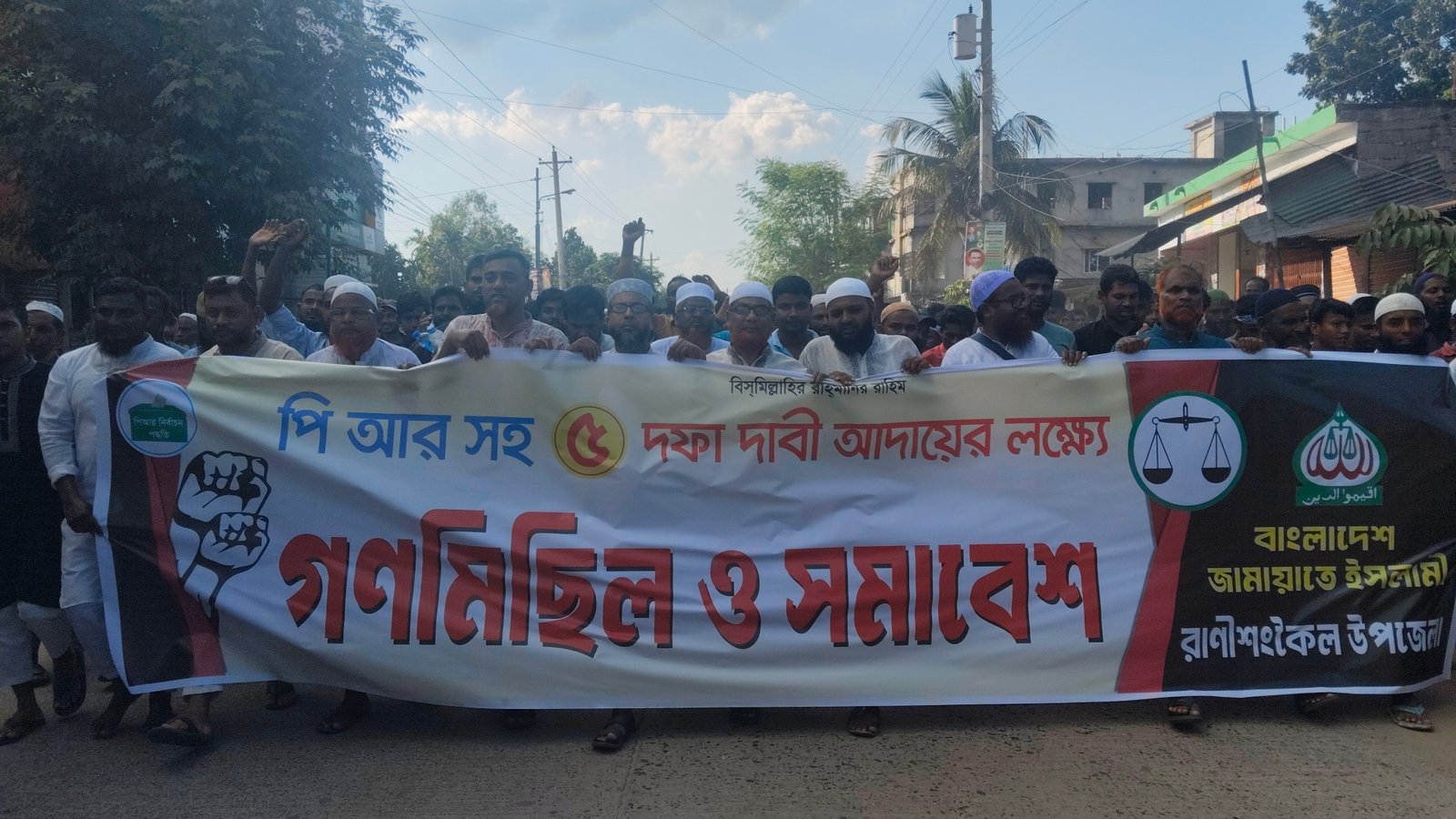 এর আগে ঠাকুরগাঁওয়ের রাণীশংকৈল উপজেলায় ২৬সেপ্টেম্বর শুক্রবার বিকাল ৩টায় উপজেলা শাখার উদ্যোগে কেন্দ্রীয় হাই স্কুল মাঠ থেকে বিক্ষোভ মিছিল শুরু হয়ে শহরের প্রধান প্রধান সড়ক, জুলাই চত্বর প্রদক্ষিণ শেষে উপজেলা চৌরাস্তা মোড়ে এসে সমাবেশে মিলিত হয়, ব্যানার, স্লোগানে সজ্জিত হাজারো নেতাকর্মীর অংশগ্রহণে মিছিলটি উৎসবমুখর পরিবেশে অনুষ্ঠিত হয়। এসময় বন্দর চৌরাস্তা মোড়ে সংক্ষিপ্ত বক্তব্য রাখেন- ঠাকুরগাঁও-৩(রাণীশংকৈল-পীরগঞ্জ) আসনে জামায়াত মনোনীত সংসদ সদস্য পদপ্রার্থী জামা য়াতের নায়েবে আমির মিজানুর রহমান মাষ্টার,জেলা জামায়াতের সেক্রেটারী আলমগীর হোসাইন, উপজেলা জামায়াত ইসলামীর আমীর মাওলানা রফিকুল ইসলাম উপজেলা জামায়াত ইসলামীর সেক্রেটরী মাওলানা রজব আলী। আগামী ফেব্রুয়ারিতে জুলাই সনদের ভিত্তিতে জাতীয় নির্বাচন অনুষ্ঠানসহ কেন্দ্র ঘোষিত ৫দফা দাবিতে রাণীশংকৈলে বিক্ষোভ মিছিল করেছে বাংলাদেশ জামায়াতে ইসলামী।