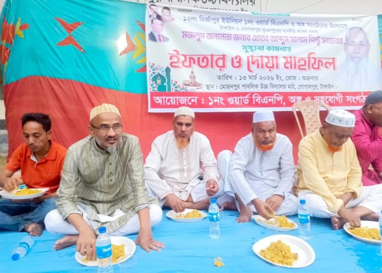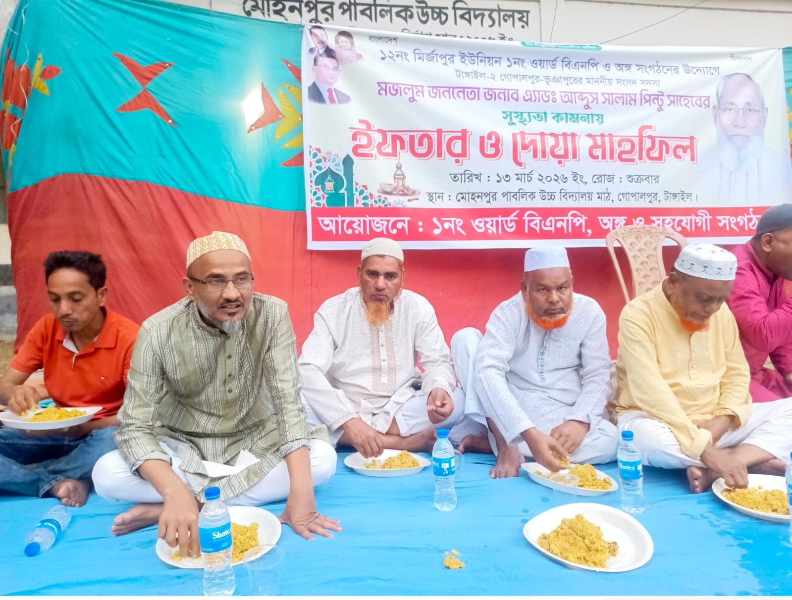 টাঙ্গাইলের গোপালপুর উপজেলার মির্জাপুর ইউনিয়নের ১ নম্বর ওয়ার্ড মোহনপুর বিএনপি ও এর অঙ্গসংগঠনের উদ্যোগে স্থানীয় সংসদ সদস্য অ্যাডভোকেট আব্দুস সালাম পিন্টুর সুস্থতা কামনায় ইফতার ও দোয়া মাহফিল অনুষ্ঠিত হয়েছে।