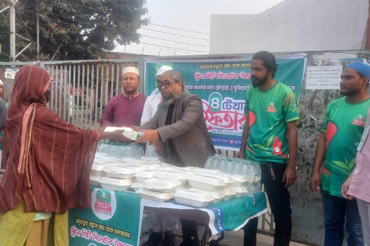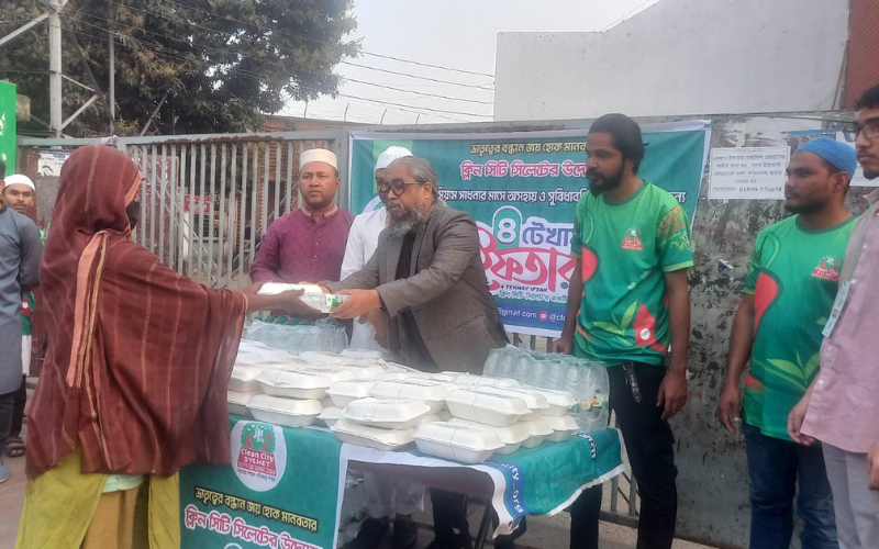 সিলেটে অসহায় ও সুবিধাবঞ্চিতদের মধ্যে চার টেখায় ইফতার বিতরণ করেছে স্বেচ্ছাসেবী সংগঠন ‘ক্লিন সিটি সিলেট’। শুক্রবার (২৭ ফেব্রয়ারি) নগরীর রিকাবীবাজার পয়েন্টে টানা ষষ্ঠবারের মতো দুই শতাধিক মানুষের মধ্যে এসব ইফতার সামগ্রী বিতরণ করা হয়েছে।