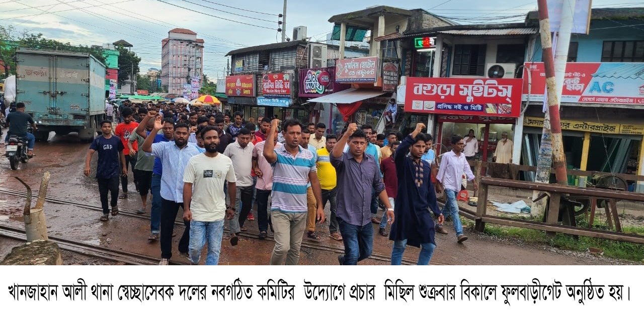 ঃ খানজাহান আলী থানা স্বেচ্ছাসেবক দলের নবগঠিত কমিটির উদ্যোগে প্রচার ও আনন্দ মিছিল শুক্রবার বিকাল ৫ টায় অনুষ্ঠিত হয়। মিছিলটি ফুলবাড়িগেট বাস স্ট্যান্ড থেকে শুরু হয়ে খুলনা যশোর মহাসড়ক দিয়ে বেগ ফিলিং স্টেশন প্রদিক্ষণ করে নগর পেট্রোল পাম্প ঘুরে এসে পুনরায় ফুলবাড়িগেট বাসস্ট্যান্ডে সংক্ষিপ্ত সমাবেশের মাধ্যমে শেষ হয়। খানজাহান আলী থানা স্বেচ্ছাসেবক দলের আহ্বায়ক মোঃ বিল্লাল হোসেনের সভাপতিত্বে এবং সদস্য সচিব মাসুম বিল্লাহ এর পরিচালনায় বক্তৃতা করেন এমদাদ মোড়ল,মোঃ মামুন শেখ ,মোঃ আল আমিন শেখ,মোক্তার হোসেন,হাসান শেখ ,নুর ইসলাম ,রেজাউল ইসলাম ,ইমরান মোল্লা ,এসএম লিটন ,রাকিবুল ইসলাম,শেখ বাহাউদ্দিন ,মাসুম হোসেন,মাসুদ হোসেন ,আলী আক্কাস,আলাউদ্দিন পাটোয়ারি, মোঃ শুকুর শেখ,মোঃ আলমগীর হোসেন ইমন,শেখ রাব্বি, সুমন হাওলাদার,আলী,আশরাফুল ইসলাম ,ইমাম হোসেন তুষার, শুকুর হাওলাদার ,সজীব,সালাউদ্দিন ,খাইরুল। মিছিল শেষে সংক্ষিপ্ত বক্তব্যে নবগঠিত থানা স্বেচ্ছাসেবক দলের সদস্য সচিব মাসুম বিল্লাহ বলেন খান জাহানআলী থানা স্বেচ্ছাসেবক দলের নবগঠিত কমিটি ঘোষনা করায় থানা সেচ্ছাসেবক দলের পক্ষ থেকে এ কর্মসুচির আয়োজন করা হয়েছে। তিনি সাবেক প্রধানমন্ত্রী বেগম খালেদা জিয়ার শুভ জন্মদিন এর শুভেচ্ছা এবং তার দ্রুত সুস্থতা কামনা করেন। এছাড়া কমিটি ঘোষনা করায় খুলনা মহানগর স্বেচ্ছাসেবক দলের আহ্বায়ক ও সদস্য সচিব কে আন্তরিক অভিনন্দন ও শুভেচ্ছা জানান।