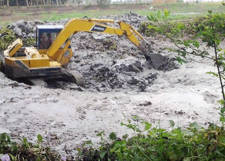 ভেকু মেশিন ব্যবহার করে ধান লাগানোর জন্য প্রস্তুতকৃত জমি ক্ষতিগ্রস্ত হচ্ছে এবং পুকুরের পাড় তৈরির কাজ চলছে বলে অভিযোগ করেছেন স্থানীয় কৃষকরা।