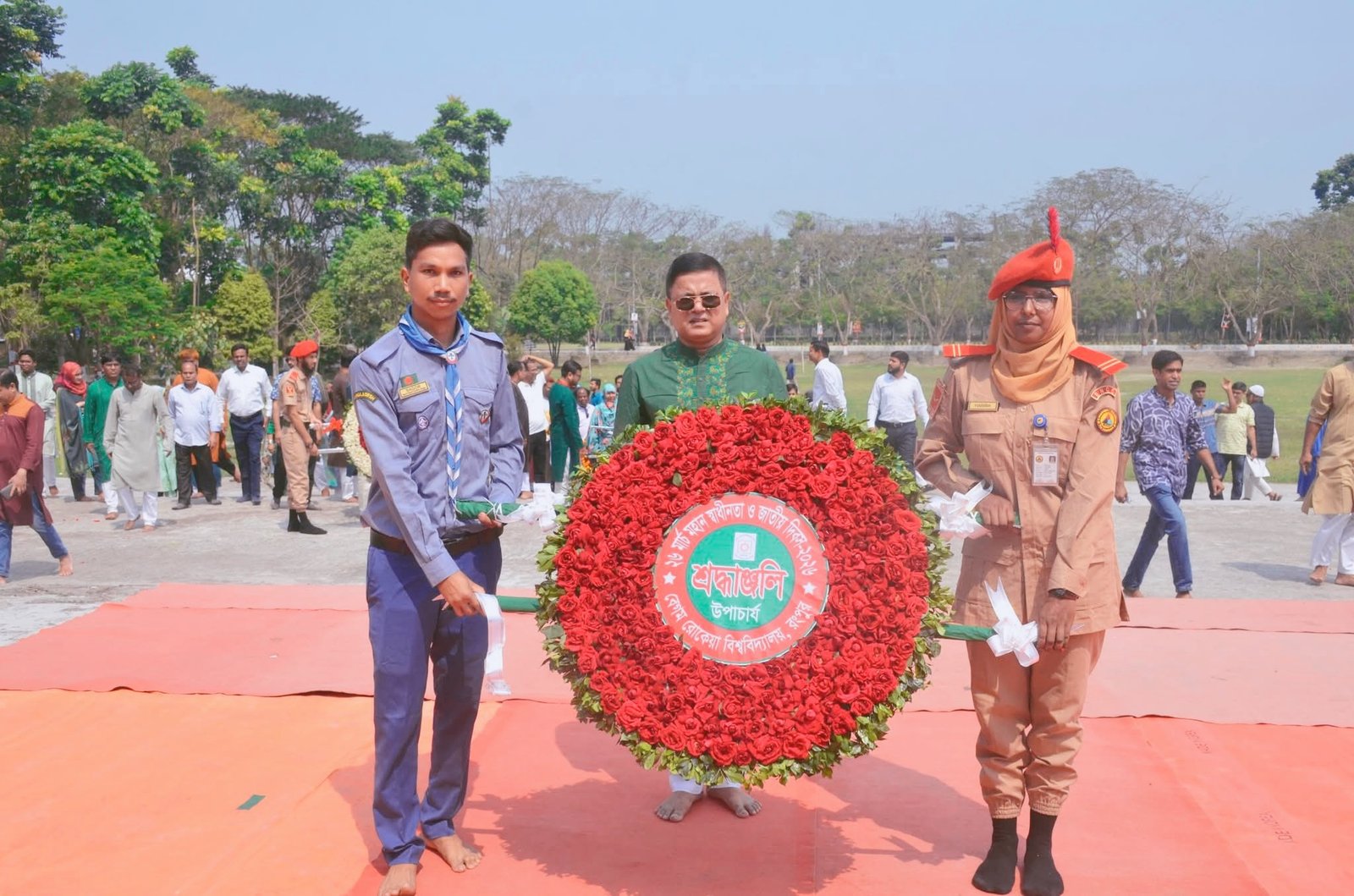 এরপর স্বাধীনতা স্মারকে মহান মুক্তিযুদ্ধে বীর শহীদদের প্রতি শ্রদ্ধাঞ্জলি অর্পণ করেন উপাচার্য প্রফেসর ড. মোঃ শওকাত আলী। তারপর পর্যায়ক্রমে বিশ্ববিদ্যালয়ের বিভিন্ন অনুষদ, বিভাগ, আবাসিক হল, ইনস্টিটিউট ও সংগঠনের পক্ষ থেকে পুষ্পার্ঘ্য অর্পণ করা হয়।