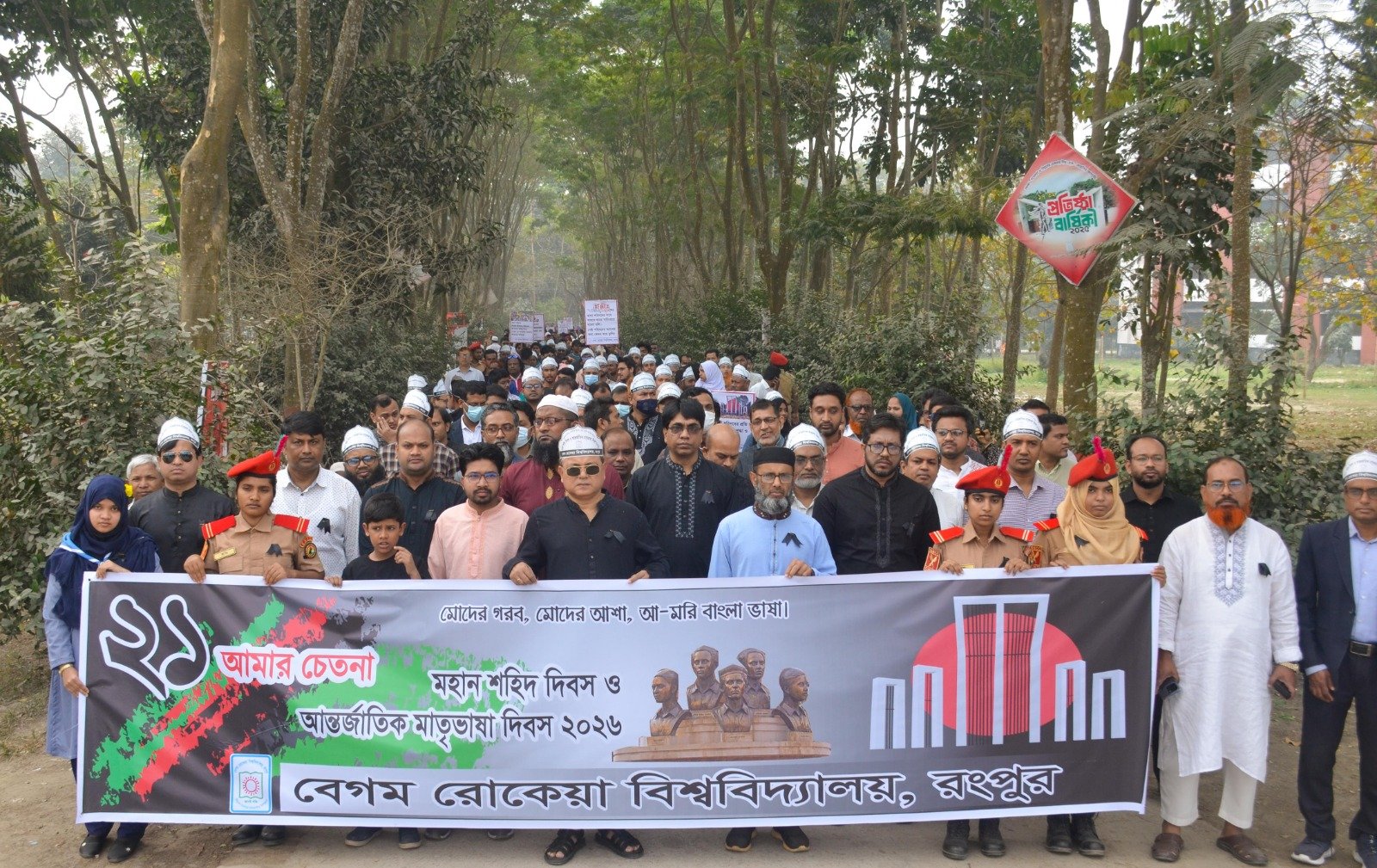 বেগম রোকেয়া বিশ্ববিদ্যালয় (বেরোবি), রংপুরে যথাযোগ্য মর্যাদায় পালিত হয়েছে মহান শহিদ দিবস ও আন্তর্জাতিক মাতৃভাষা দিবস-২০২৬। শনিবার (২১ ফেব্রুয়ারি) সকালে বাংলা ভাষার জন্য আত্মোৎসর্গকারী শহিদদের স্মরণে শোক র্যালির উদ্বোধন করেন বিশ্ববিদ্যালয়ের উপাচার্য প্রফেসর ড. মোঃ শওকাত আলী।