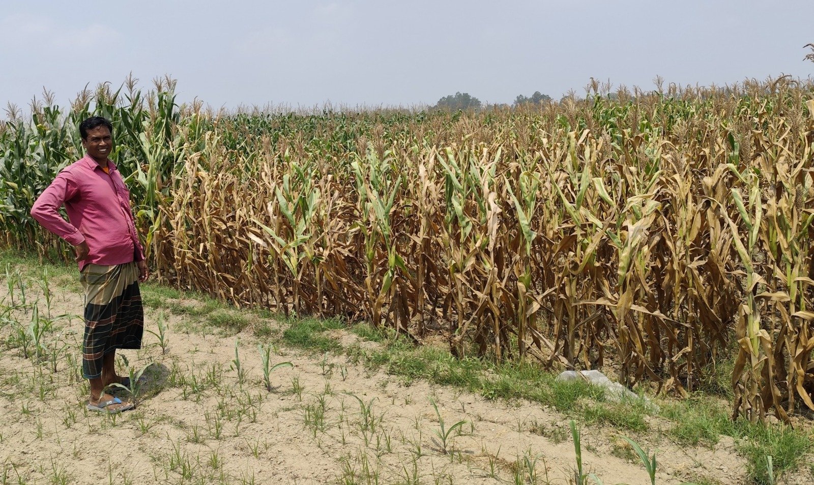 গতকাল শনিবার দুপুরে উপজেলার চকশিমলা গ্রামের পশ্চিম পাশের একটি ফসলি মাঠে সরেজমিনে দেখা যায়, পানির অভাবে কৃষক মুনসুর রহমানের কিছু ভুট্টা খেতের গাছ শুকিয়ে মরে গেছে। আবার কিছু খেতে গাছের পাতা অল্প বিস্তর সবুজ থাকলেও পানির অভাবে সেগুলোতে কোনো থোড়া বা ভুট্টার ফল আসেনি। আবার কোনো কোনো শুরু থেকেই একেবারে সেচ দিতে পারে মাটির থেকে ভুট্টা গাছ অঙ্কুরোদগমই হয়নি। কিছু গাছ মাটি বের হলেও পানি অভাবে সেগুলো বড় হতে পারেনি। ওই মাঠে থাকে মুনসুরের সব খেতের কমবেশি একই চিত্র দেখা যায়। তাঁর নিজস্ব মালিকানাধীন জমিতে একটি সেচ পাম্প বসানো আছে। পাম্প বন্ধ থাকায় চটের বস্তা দিয়ে ঢেকে রাখা হয়েছে।