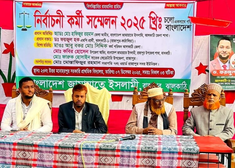 ঝালকাঠির রাজাপুরে বাংলাদেশ জামায়াত ইসলামীর উদ্যোগে আগামী জাতীয় সংসদ নির্বাচন সামনে রেখে নির্বাচনী কর্মী সম্মেলন অনুষ্ঠিত হয়েছে। রবিবার বিকেলে উপজেলার ২৩নং উত্তর মনোহরপুর সরকারি প্রাথমিক বিদ্যালয় মাঠে এই কর্মী সমাবেশে বিভিন্ন এলাকা থেকে কর্মীরা উপস্থিত হন। অনুষ্ঠানে প্রধান অতিথি ছিলেন জেলা আমীর অ্যাডভোকেট মোঃ হাফিজুর রহমান। প্রধান বক্তা ছিলেন ঝালকাঠি-১ (রাজাপুর–কাঁঠালিয়া) আসনের সংসদ সদস্য পদপ্রার্থী ড. ফয়জুল হক। বিশেষ অতিথি হিসেবে উপস্থিত ছিলেন মাওলানা আবু বকর মোঃ সিদ্দিক, মোঃ কবির হোসেন, মোঃ ফারুক হোসাইন। সম্মেলনের সভাপতিত্ব করে সদর ইউনিয়নের ৭ নং ওয়ার্ডের জামাতের সভাপতি মোঃ মোস্তাফিজুর রহমান।