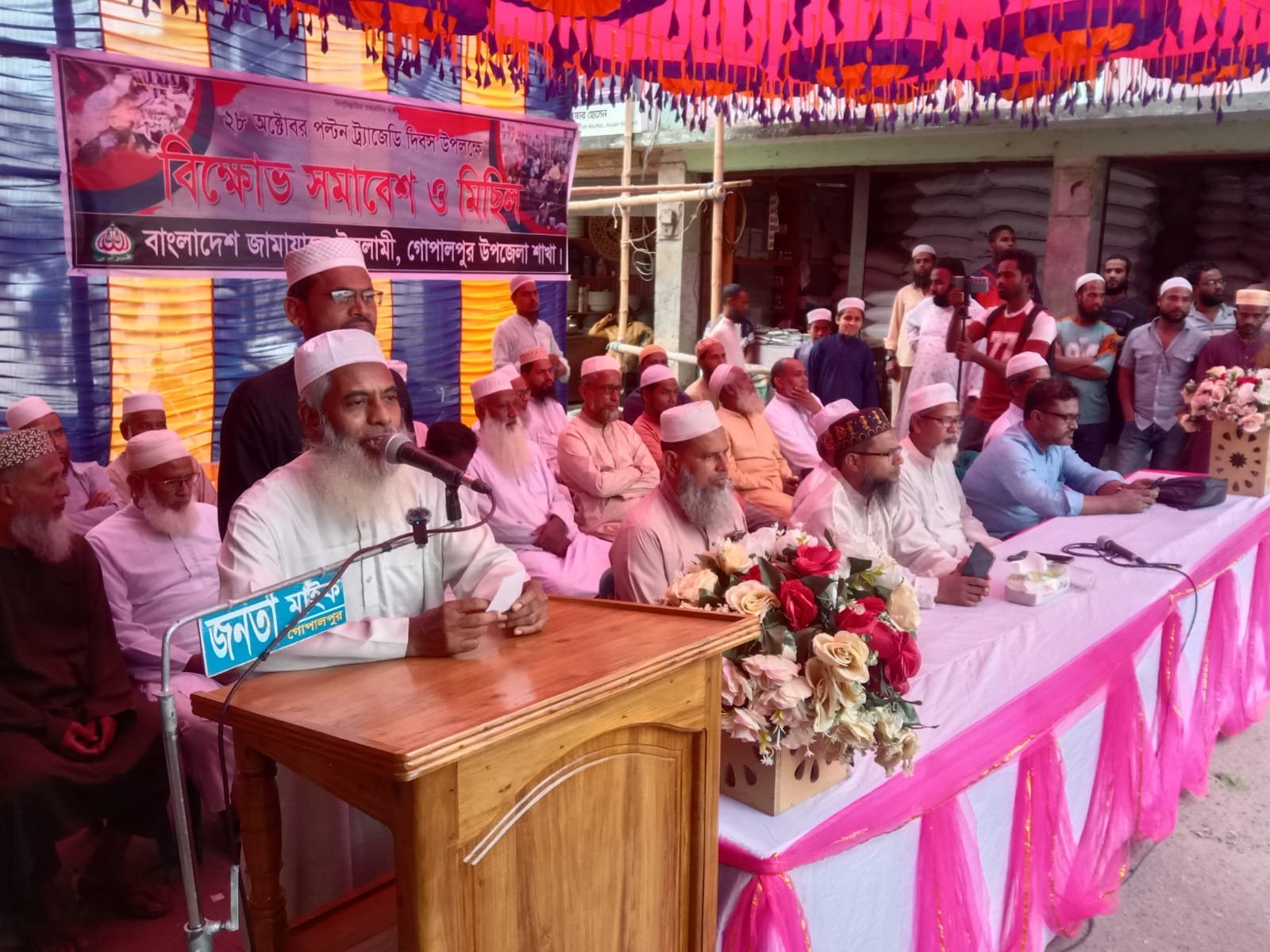 বুধবার (২৯ অক্টোবর) বিকেলে গোপালপুর থানার সামনে উপজেলা জামায়াতে ইসলামী’র উদ্যোগে এ বিক্ষোভ সমাবেশ ও মিছিল অনুষ্ঠিত হয়।