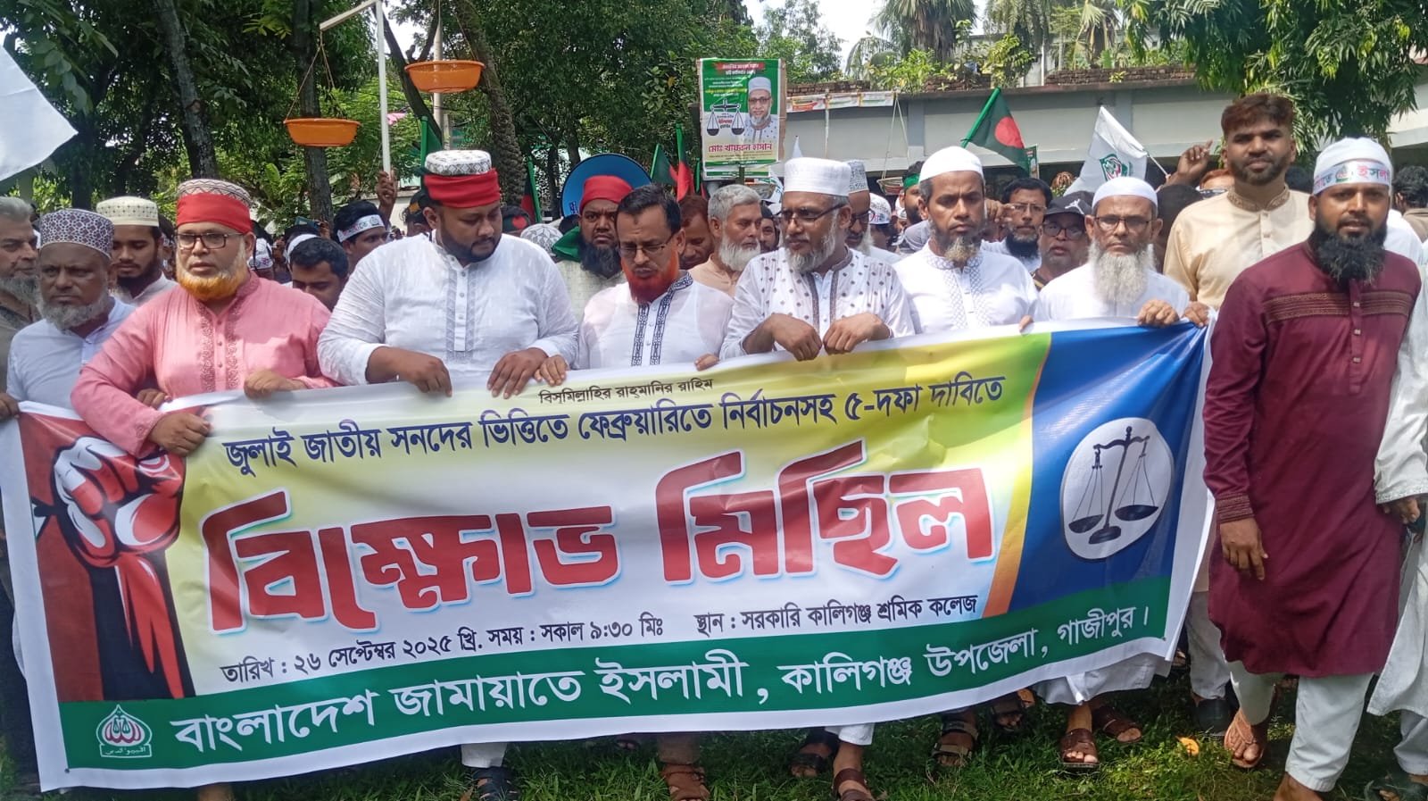 জুলাই জাতীয় সনদের ভিত্তিতে এবং পিআর পদ্ধতিতে জাতীয় সংসদ নির্বাচনসহ ৫ দফা দাবীতে গাজীপুরের কালীগঞ্জে সমাবেশ ও বিক্ষোভ মিছিল করেছে জামায়াত।