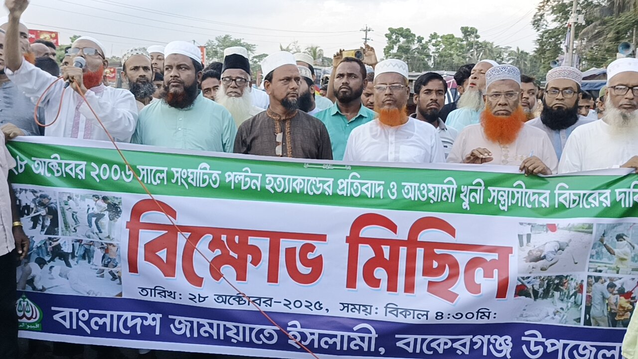 ২৮ অক্টোবর মঙ্গলবার বিকাল ৪ঃ০০ টায় বাকেরগঞ্জ থানা মসজিদের সামনে থেকে উপজেলা জামায়াতে ইসলামী আয়োজনে এ বিক্ষোভ মিছিল অনুষ্ঠিত হয়।