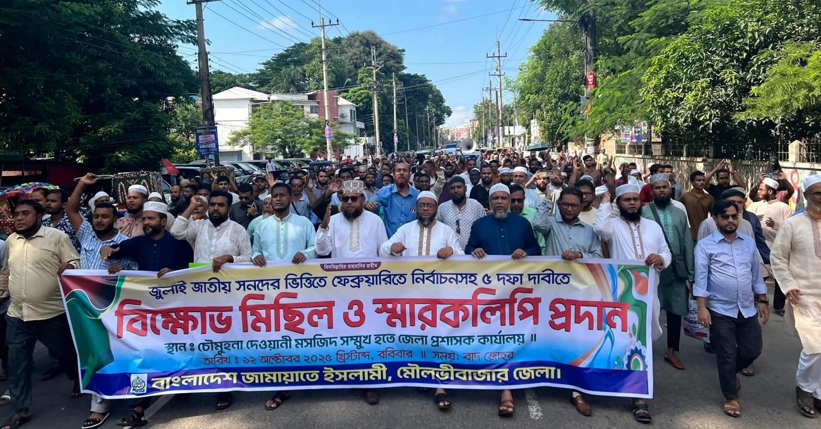 আগামী ফেব্রুয়ারিতে নির্ধারিত জাতীয় নির্বাচনকে সামনে রেখে ‘জুলাই জাতীয় সনদ বাস্তবায়ন’সহ ৫ দফা দাবিতে মৌলভীবাজারে বিক্ষোভ মিছিল ও জেলা প্রশাসকের কাছে স্মারকলিপি দিয়েছে বাংলাদেশ জামায়াতে ইসলামী।