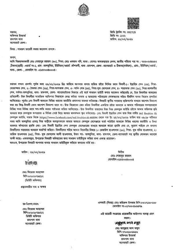 এ ঘটনায় বৃহস্পতিবার (২৬ ফেব্রুয়ারি ২০২৬) রামপাল থানায় সাধারণ ডায়েরি নং-১১২২ দায়ের করা হয়। জিডির তদন্তভার দেওয়া হয়েছে এসআই জহিরুল ইসলামকে। তিনি জানান, অভিযোগের বিষয়ে তদন্ত চলছে; তদন্ত শেষে প্রয়োজনীয় আইনগত ব্যবস্থা গ্রহণ করা হবে।