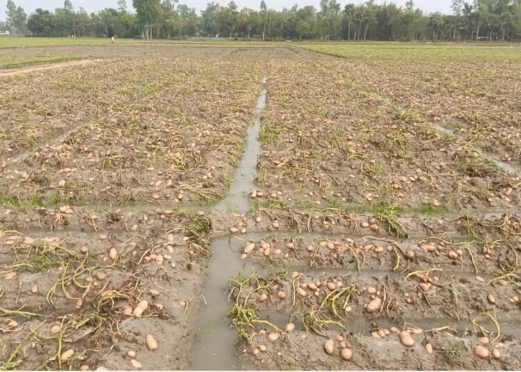 হঠাৎ সকালের প্রায় এক ঘণ্টার ভারি বৃষ্টিতে উপজেলার বিস্তীর্ণ ফসলি জমি পানির নিচে তলিয়ে গেছে। বিশেষ করে আলু উত্তোলনের শেষ সময়ে জমে থাকা পানিতে ডুবে গেছে আলু, গমসহ বিভিন্ন ফসলের ক্ষেত। এতে চরম দুশ্চিন্তায় পড়েছেন স্থানীয় কৃষকরা।