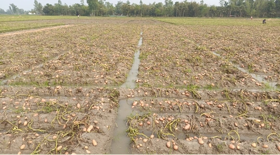 বৃহস্পতিবার সরেজমিনে উপজেলার বিভিন্ন মাঠ ঘুরে দেখা যায়, অনেক জমিতে বৃষ্টির পানি জমে আছে। উঁচু এলাকা থেকে নেমে আসা পানি নিচু জমিতে জমে থাকায় জমিতে রাখা আলু পানির নিচে তলিয়ে গেছে। ফলে অনেক কৃষক সম্ভাব্য ক্ষতির আশঙ্কায় উদ্বিগ্ন হয়ে পড়েছেন।