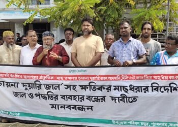 রনজিৎ বর্মন, (সাতক্ষীরা.প্রতিনিধি): বাংলাদেশের উপকূলীয় নদ-নদীতে “চায়না দুয়ারি জাল”সহ ক্ষতিকর বিদেশি মাছ ধরার জাল ও পদ্ধতি নিষিদ্ধ করার দাবিতে সাতক্ষীরার ...