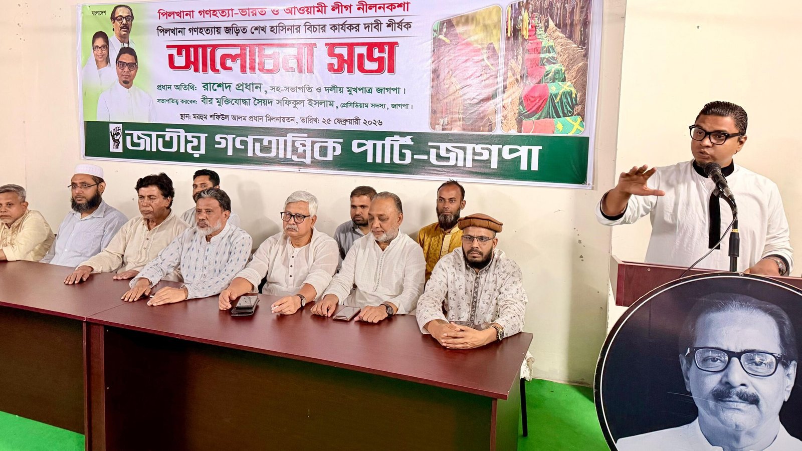আজ ২৫ ফেব্রুয়ারি সকাল ১১ টায় পল্টনস্থ শফিউল আলম প্রধান মিলনায়তনে ‘শহীদ সেনা দিবস’ উপলক্ষে জাগপা আয়োজিত আলোচনা সভায় প্রধান অতিথির বক্তব্যে তিনি এসব কথা বলেন। জাগপা প্রেসিডিয়াম সদস্য বীর মুক্তিযোদ্ধা সৈয়দ শফিকুল ইসলামের সভাপতিত্বে সভায় আরও বক্তব্য রাখেন- জাগপা সাধারণ সম্পাদক অধ্যাপক ইকবাল হোসেন, প্রেসিডিয়াম সদস্য আসাদুর রহমান খান, হাজী মো. হাসমত উল্লাহ, সাংগঠনিক সম্পাদক আশরাফুল ইসলাম হাসু, প্রকাশনা বিষয়ক সম্পাদক এস এম জিয়াউল আনোয়ার, জাগপা