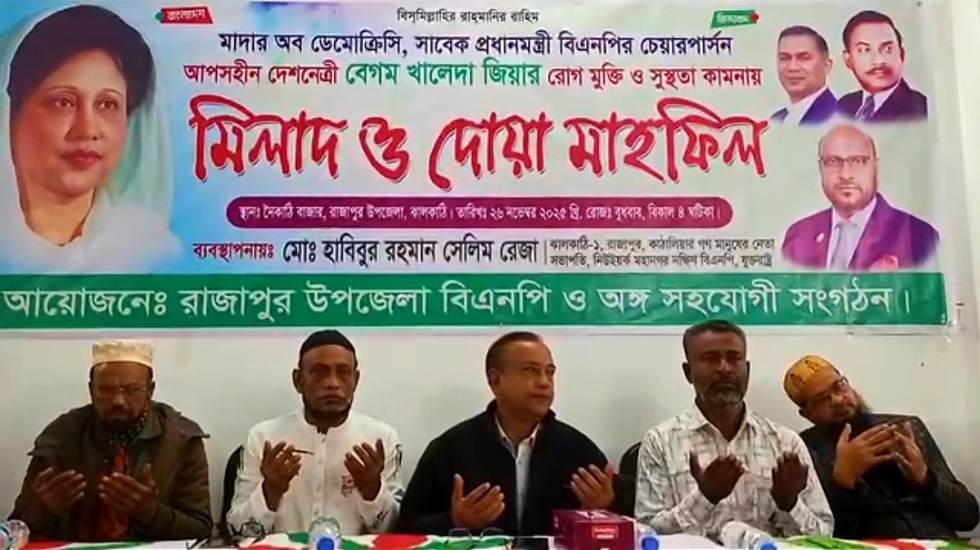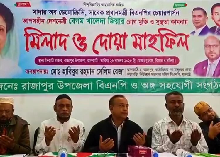 ঝালকাঠির রাজাপুরে বিএনপির চেয়ারপার্সন বেগম খালেদা জিয়ার রোগমুক্তি ও সুস্থতা কামনায় মিলাদ ও দোয়া মাহফিল অনুষ্ঠিত হয়েছে। বুধবার বিকেলে নৈকাঠি বাজারে রাজাপুর উপজেলা বিএনপি ও অঙ্গ সহযোগী সংগঠনের একাংশের উদ্যোগে এ দোয়া মাহফিল আয়োজন করা হয়। অনুষ্ঠানে পবিত্র দোয়ার মাধ্যমে দেশনেত্রীর শারীরিক সুস্থতা, দীর্ঘায়ু এবং দ্রুত আরোগ্য কামনা করা হয়। মিলাদ মাহফিলে বিএনপি ও অঙ্গ সংগঠনের নেতা-কর্মীদের পাশাপাশি সাধারণ জনগণও অংশগ্রহণ করেন। দোয়া মাহফিলের ব্যবস্থাপনায় করেন ঝালকাঠি-১ আসনের বিএনপির মনোনয়ন প্রত্যাশি যুক্তরাষ্ট্রের নিউইয়র্ক মহানগর দক্ষিণ বিএনপির সভাপতি মোঃ হাবিবুর রহমান সেলিম রেজা।