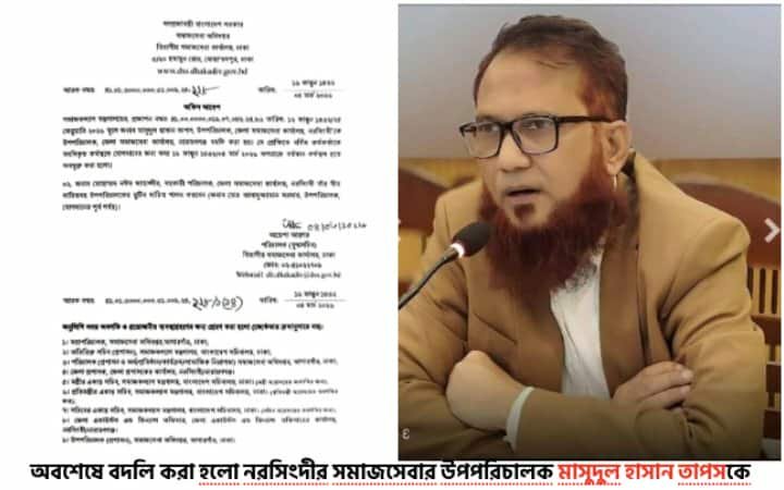 সমাজসেবা অধিদপ্তরের বিভাগীয় সমাজসেবা কার্যালয়, ঢাকা থেকে জারি করা এক অফিস আদেশে জানানো হয়, সমাজকল্যাণ মন্ত্রণালয়ের প্রশাসন শাখার প্রজ্ঞাপনের আলোকে মাসুদুল হাসান তাপসকে নরসিংদী থেকে নারায়ণগঞ্জে বদলি করা হয়েছে। গত ৪ মার্চ ২০২৬ তারিখে এ সংক্রান্ত অফিস আদেশ জারি করা হয়।