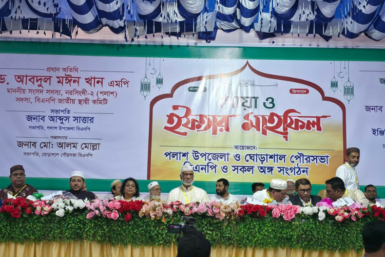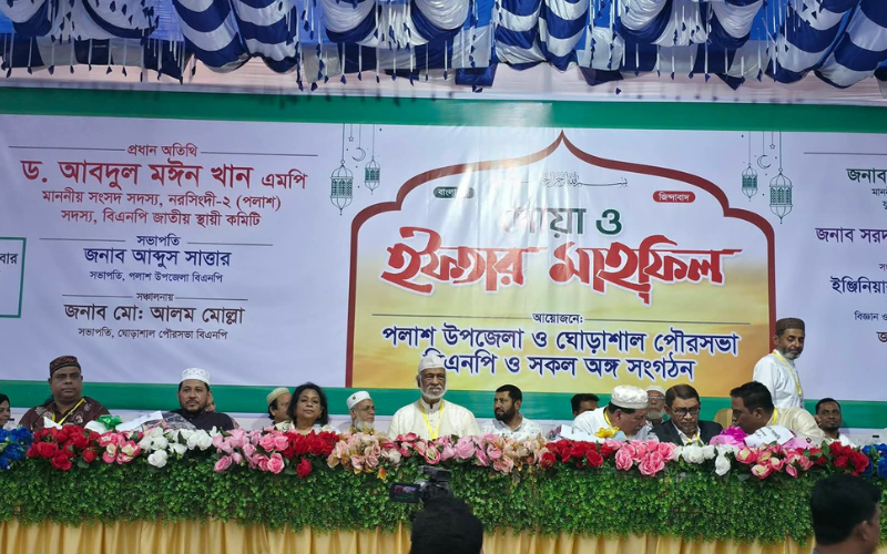 নরসিংদীর পলাশ উপজেলা ও ঘোড়াশাল পৌরসভার সকল অঙ্গ ও সহযোগী সংগঠনের আয়োজনে অনুষ্ঠিত ইফতার মাহফিলে প্রধান অতিথির বক্তব্যে বাংলাদেশ জাতীয়তাবাদী দল (বিএনপি)’র স্থায়ী কমিটির সদস্য ও নরসিংদী-২ আসনের সংসদ সদস্য ড. আবদুল মঈন খান বলেছেন,“আগামীর বাংলাদেশে ঐক্যবন্ধভাবে নরসিংদী নেতৃত্ব দিবে।”