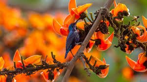 পলাশের প্রতিটি ডাল এখন ব্যস্ততায় ভরপুর: চড়ুই-শালিক: কেউ ফুলে ঠোঁট ছোঁয়ায়, কেউ বা ডানা ঝাপটিয়ে এক ডাল থেকে অন্য ডালে ওড়ে। কোকিল বসন্তের সুর বেঁধে দেয় তার চিরচেনা কুহুতানে।  অনেক পাখি আবার কোনো শব্দ না করে শুধু রোদে ডানা মেলে প্রকৃতির এই রূপ উপভোগ করে।