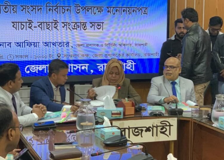 জেলা প্রশাসক ও জেলা রিটার্নিং কর্মকর্তা আফিয়া আখতার সভায় সভাপতিত্ব করেন। সভা থেকে রাজশাহী-১ আসনের ছয়জন প্রার্থীর মধ্যে তিনজনের মনোনয়ন বাতিল ঘোষণা করা হয়েছে। আর তিনজনের মনোনয়ন বৈধ ঘোষণা করা হয়েছে। অপর দিকে রাজশাহী-২ আসনের প্রার্থী ছিলেন ৯ জন। এর মধ্যে তিনজনের মনোনয়ন বাতিল হয়েছে। এ ছাড়া ছয়জনের মনোনয়ন বৈধ ঘোষণা করেছেন জেলা রিটার্নিং কর্মকর্তা।