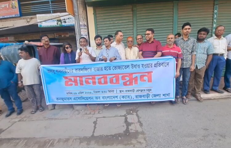 অসাধু ব্যবসায়ীদের কারসাজিতে বাজার থেকে ভোজ্যতেল উধাও এবং কৃত্রিম সংকট সৃষ্টির প্রতিবাদে রাজবাড়ীতে মানববন্ধন কর্মসূচি অনুষ্ঠিত হয়েছে।