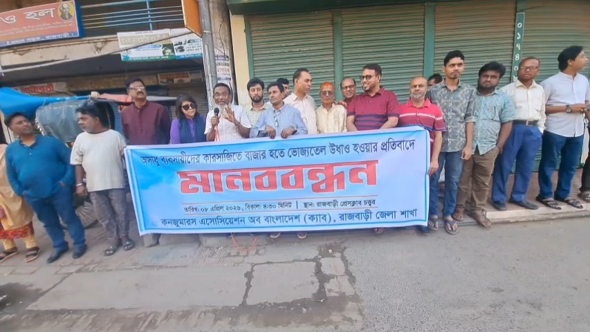 অসাধু ব্যবসায়ীদের কারসাজিতে বাজার থেকে ভোজ্যতেল উধাও এবং কৃত্রিম সংকট সৃষ্টির প্রতিবাদে রাজবাড়ীতে মানববন্ধন কর্মসূচি অনুষ্ঠিত হয়েছে।