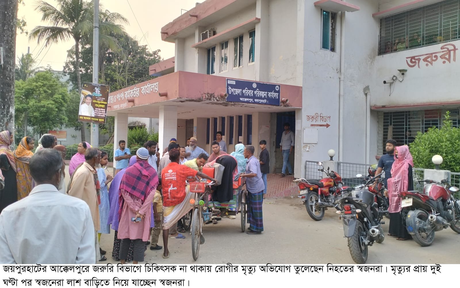 জয়পুরহাটের আক্কেলপুর উপজেলা স্বাস্থ্য কমপ্লেক্সের জরুরি বিভাগে দায়িত্বরত চিকিৎসক না থাকায় চিকিৎসা বিলম্বের কারণে জোসনা আরা (৬৫) নামে এক অবসরপ্রাপ্ত শিক্ষিকার মৃত্যুর হয়েছে বলে অভিযোগ উঠেছে। মঙ্গলবার দুপুর ৩টার দিকে এ ঘটনা ঘটে। এ ঘটনায় ক্ষুব্ধ স্বজনেরা জরুরি বিভাগে চিৎকার-চেচামেচি করেন। পরে পুলিশ গিয়ে পরিস্থিতি শান্ত করে। মৃত্যুর প্রায় দুই ঘণ্টা পর স্বজনেরা লাশ বাড়িতে নিয়ে যান।