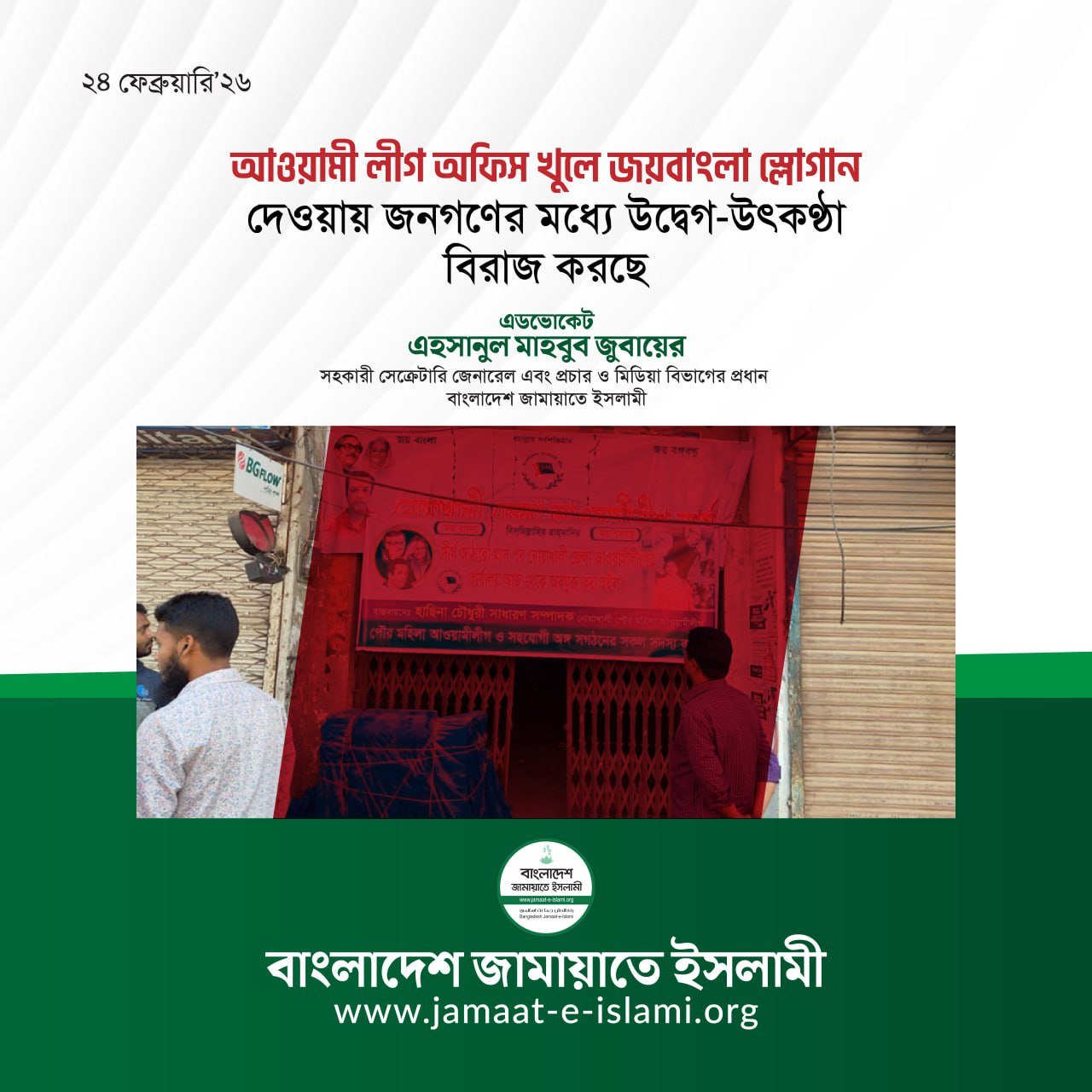 জামায়াতের এই শীর্ষ নেতা আরও দাবি করেন, আওয়ামী লীগ দেশের বিভিন্ন জায়গায় পুনরায় তাদের দলীয় অফিস খুলে ‘জয়বাংলা’ স্লোগান দিচ্ছে এবং একটি ভীতিকর পরিবেশ সৃষ্টি করছে। এর ফলে সাধারণ মানুষের মধ্যে তীব্র ক্ষোভ ও উদ্বেগ-উৎকণ্ঠা বিরাজ করছে। দেশে আবারও অতীতের জুলুম-নির্যাতনের পুনরাবৃত্তির আশঙ্কা তৈরি হলেও সরকার ও প্রশাসনের পক্ষ থেকে কোনো কার্যকর পদক্ষেপ লক্ষ্য করা যাচ্ছে না বলে তিনি মন্তব্য করেন।