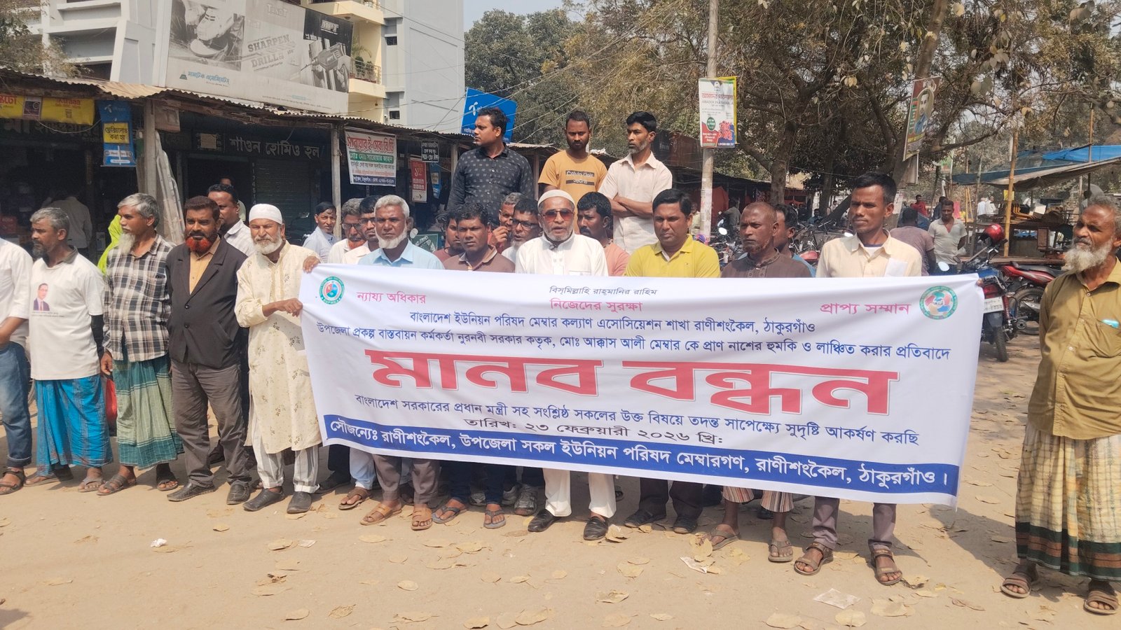 সোমবার দুুপুরে রাণীশংকৈল উপজেলা পরিষদের সামনে প্রকল্প বাস্তবায়ন কর্মকর্তা নূরুন্নবী সরকার কর্তৃক ইউপি সদস্য আক্কাশ আলীকে প্রাণ নাশের হুমকি ও লাঞ্চিত করার প্রতিবাদে মানববন্ধন করেছে রাণীশংকৈল উপজেলার সকল ইউপি সদস্যদের ব্যানারে। এ সময় বক্তারা দূর্নীতিবাজ পিআইও-র অপসারণসহ শাস্তির দাবী জানান তারা।