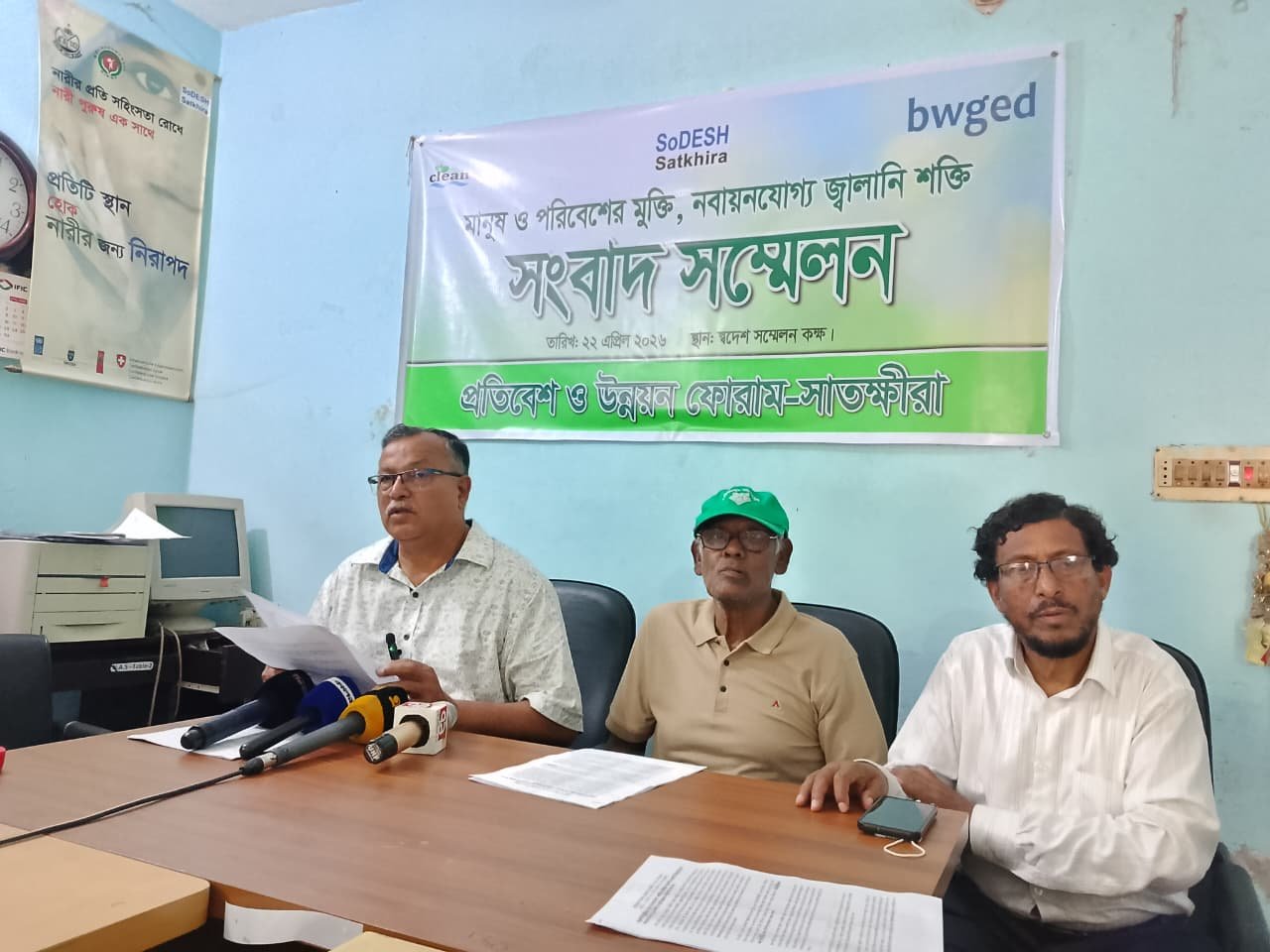 বেসরকারী উন্নয়ন সংস্থা স্বদেশ, ক্লিন এবং বিডব্লিউব্লিইডি এর সহযোগিতায় প্রতিবেশ ও উন্নয়ন ফোরাম সাতক্ষীরার পক্ষে সংবাদ সম্মেলনে লিখিত বক্তব্য পাঠ করেন স্বদেশ’র নির্বাহি পরিচালক ও জেলা প্রতিবেশ ও উন্নয়ন ফোরামের সদস্য সচিব মাধব চন্দ্র দত্ত।এসময় উপস্থিত ছিলেন জেলা প্রতিবেশ ও উন্নয়ন ফোরামের সভাপতি বিশিষ্ট শিক্ষাবিদ সাবেক অধ্যক্ষ মো. আব্দুল হামিদ প্রমুখ।