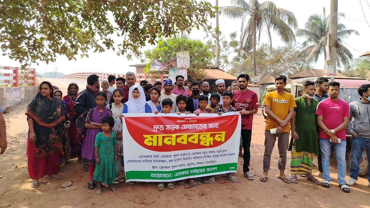 শনিবার সকালে শিবচর উপজেলা ভদ্রাসন ইউনিয়নের ক্রোকচর এলাকায় আয়োজিত এক বিশাল মানববন্ধনে এলাকাবাসী একজোট হয়ে প্রতিবাদ জানান।