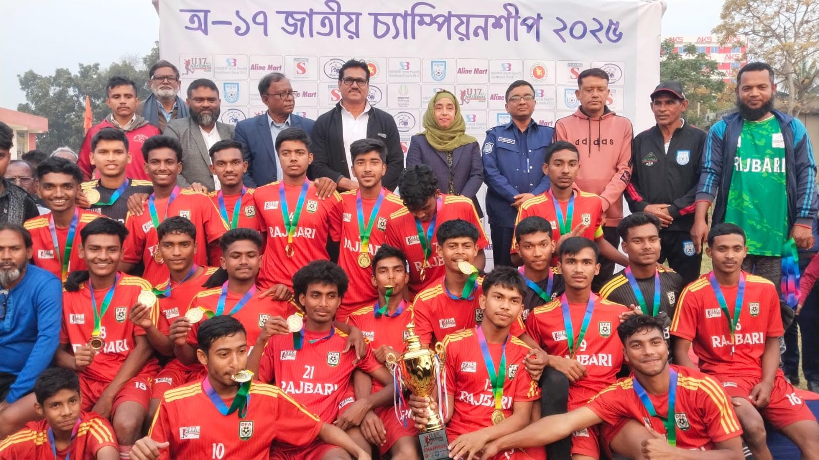 অনূর্ধ্ব-১৭ জাতীয় ফুটবল চ্যাম্পিয়নশিপ–২০২৫ এর ধলেশ্বরী জোনের ফাইনালে ঢাকা জেলা দলকে টাইব্রেকারে পরাজিত করে চ্যাম্পিয়ন হওয়ার গৌরব অর্জন করেছে রাজবাড়ী জেলা দল।