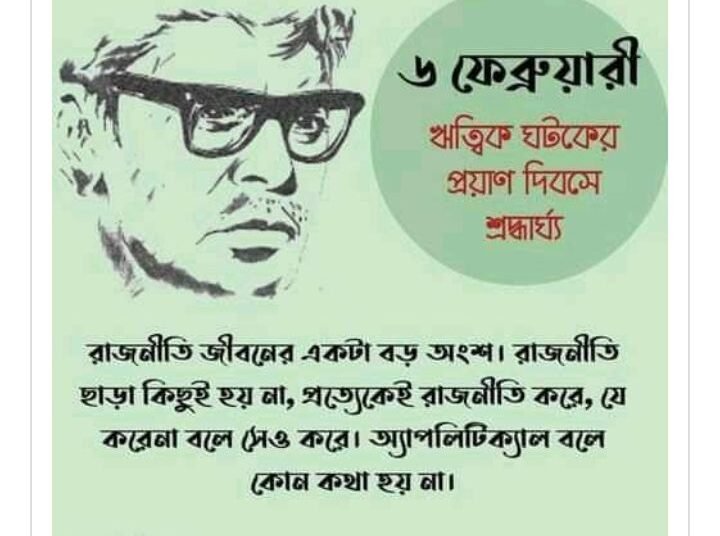 সৃষ্টিতে উল্লাস খুঁজে পাওয়া এই ক্ষ্যাপা নির্মাতার চলে যাওয়ার দিন আজ। ১৯৭৬ সালের ৬ ফেব্রুয়ারি ঋত্বিক ঘটক না ফেরার দেশে পাড়ি জমিয়েছিলেন। প্রয়াণ দিনে খ্যাতিমান এই চলচ্চিত্রকারের প্রতি শ্রদ্ধা।