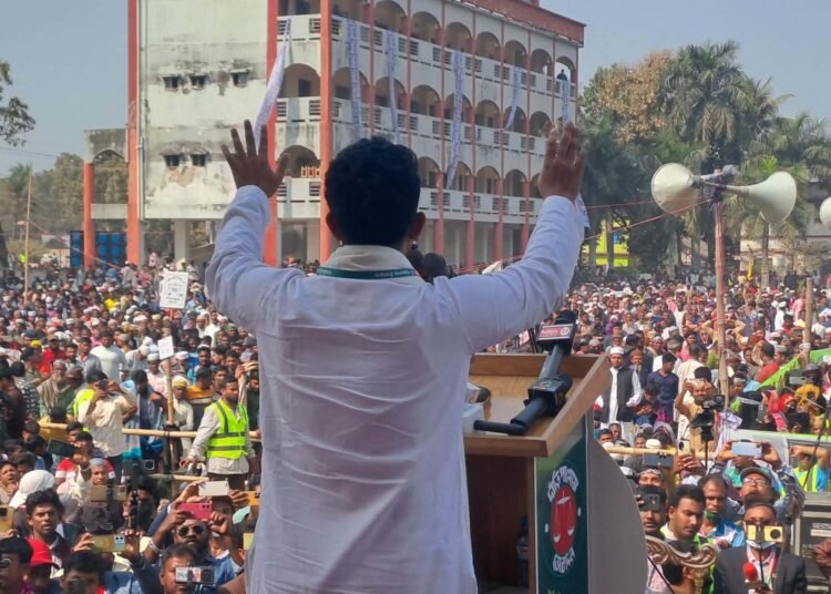 ছবিতে দেখা গেছে, শ্যামনগরে জামায়াতের জনসভায় ডাকসুর নির্বাচিত ভিপি সাদিক কায়েম বক্তব্য রাখছেন।