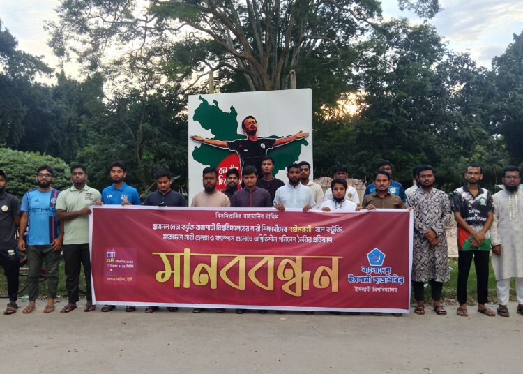 রাজশাহী বিশ্ববিদ্যালয়ের (রাবি) নারী শিক্ষার্থীদের “যৌনকর্মী” বলায় ছাত্রদল নেতার বিরুদ্ধে প্রতিবাদ জানিয়ে মানববন্ধন করেছে ইসলামী বিশ্ববিদ্যালয় (ইবি) শাখা ছাত্রশিবির। বৃহস্পতিবার (৪ সেপ্টেম্বর) বিকেল সাড়ে পাঁচটার দিকে বিশ্ববিদ্যালয়ের প্রধান ফটকের সামনে তারা মানববন্ধন করে।