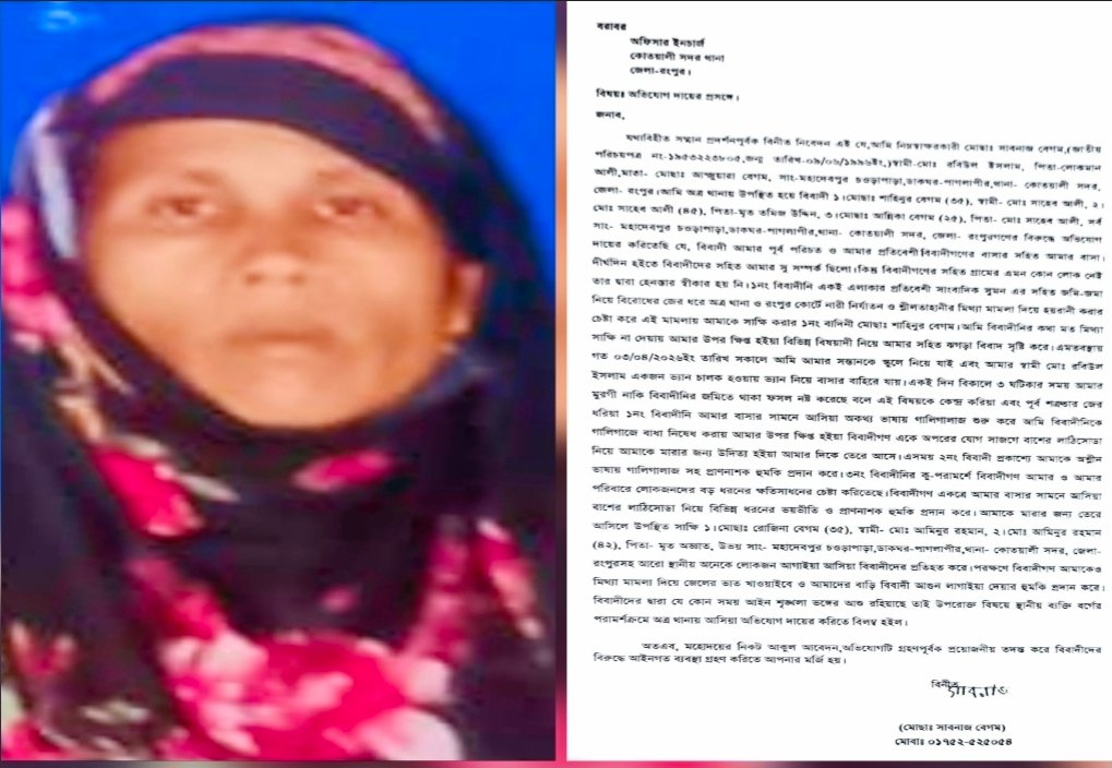 রংপুরের কোতয়ালী সদর থানার মহাদেবপুর চওড়াপাড়া (পশ্চিম পাড়া) এলাকায় স্থানীয় এক প্রবাসী সাংবাদিককে জড়িয়ে দায়ের করা মামলায় মিথ্যা সাক্ষ্য দিতে অস্বীকৃতি জানানোয় এক গৃহবধূকে মারধরের চেষ্টা, গালিগালাজ ও প্রাণনাশের হুমকি দেওয়ার অভিযোগ উঠেছে প্রতিবেশী আপন সৎ বোনের বিরুদ্ধে। এ ঘটনায় ভুক্তভোগী থানায় লিখিত অভিযোগ দায়ের করেছেন।