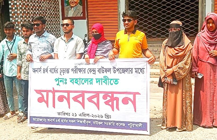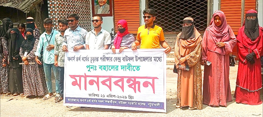 পটুয়াখালীর বাউফল-এ অনার্স ৪র্থ বর্ষের চূড়ান্ত পরীক্ষার কেন্দ্র হঠাৎ স্থানান্তরের প্রতিবাদে মানববন্ধন করেছেন শিক্ষার্থীরা। মঙ্গলবার (২১ এপ্রিল ২০২৬) সকালে বাউফল সরকারি কলেজ প্রাঙ্গণ থেকে শুরু হওয়া কর্মসূচি শহরের প্রধান সড়ক প্রদক্ষিণ শেষে প্রেসক্লাবের সামনে শেষ হয়।