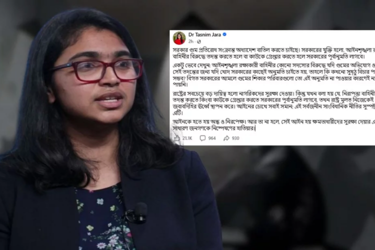 গুম প্রতিরোধ সংক্রান্ত অধ্যাদেশ বাতিলের উদ্যোগ নেওয়া হচ্ছে—এমন অভিযোগ তুলে উদ্বেগ প্রকাশ করেছেন জাতীয় নাগরিক পার্টির (এনসিপি) সাবেক যুগ্ম সদস্য সচিব ডা. তাসনিম জারা।