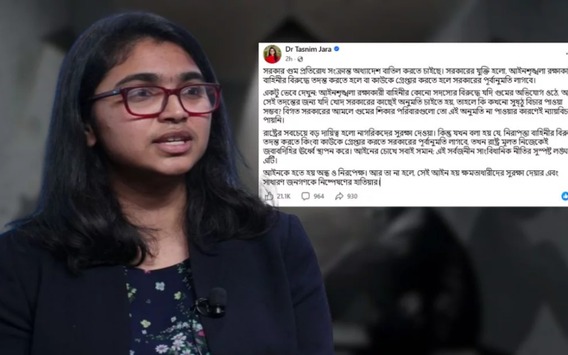 তাসনিম জারা মনে করেন, এ ধরনের বিধান কার্যকর হলে গুম সংক্রান্ত অভিযোগের নিরপেক্ষ তদন্ত ব্যাহত হতে পারে এবং রাষ্ট্রের জবাবদিহি দুর্বল হয়ে পড়বে। তার মতে, আইনের চোখে সবাই সমান—এই মৌলিক নীতির সঙ্গে এমন সিদ্ধান্ত সাংঘর্ষিক।