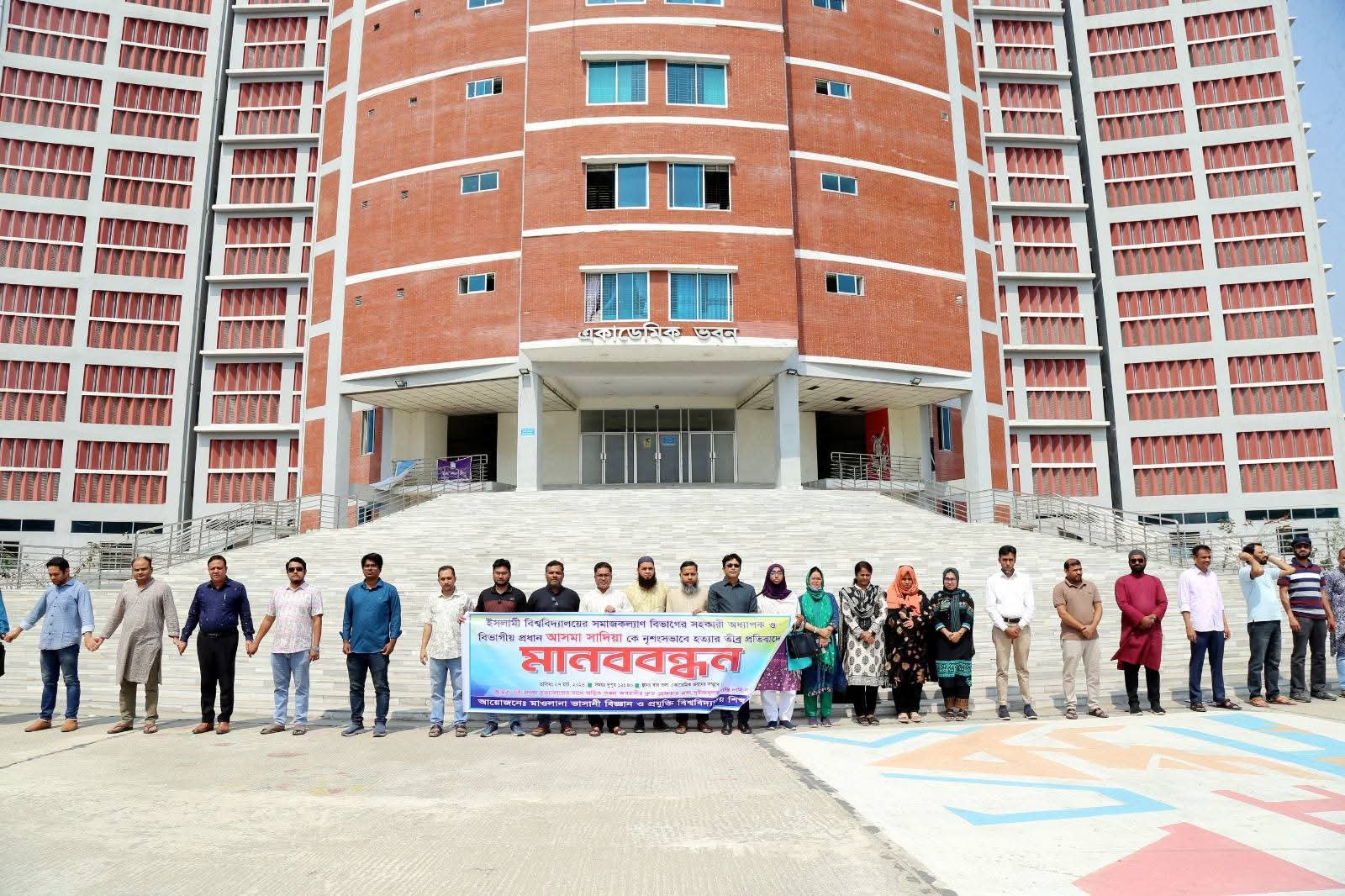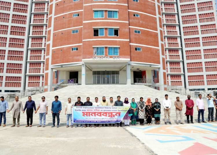 শনিবার (৭ মার্চ) বিশ্ববিদ্যালয়ের একাডেমিক ভবনের সামনে অনুষ্ঠিত এ মানববন্ধনে বিভিন্ন বিভাগের শিক্ষকরা স্বতঃস্ফূর্তভাবে অংশগ্রহণ করেন। তারা হত্যাকাণ্ডের তীব্র নিন্দা জানিয়ে দ্রুত সুষ্ঠু তদন্তের মাধ্যমে দোষীদের আইনের আওতায় এনে দৃষ্টান্তমূলক শাস্তির দাবি জানান।